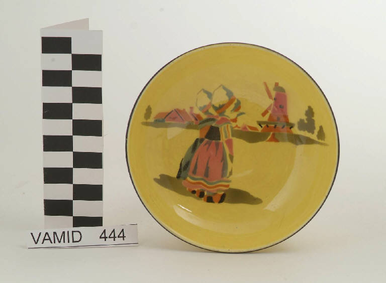 Ciotola circolare; fondo giallo decorato con paesaggio olandese in rosa, arancio, marrone, azzurro e verde; bordo rifinito con filettatura nera.