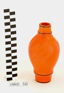 Vaso dalla forma panciuta; beccuccio e piede circolari; fondo color arancio con piede e beccuccio profilati di nero.