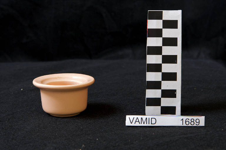 Portacandela con corpo cilindrico; bordo estroflesso; fondo color rosa chiaro.