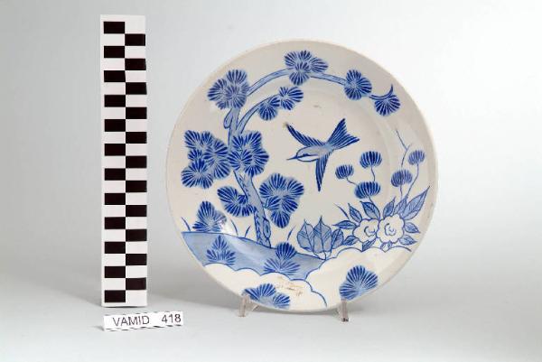 Piatto circolare; fondo bianco con motivo vegetale e animale (albero, fiori e uccellino) in blu e azzurro.