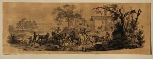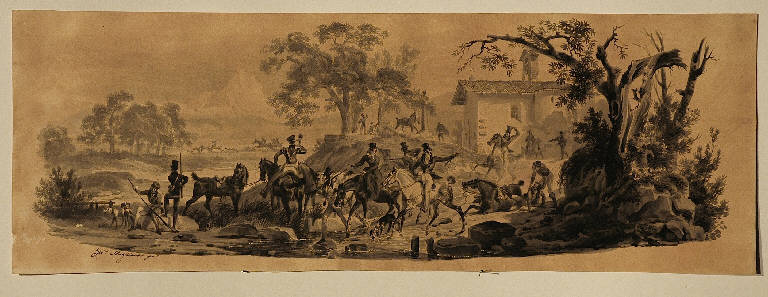 - NOTIZIE STORICO CRITICHE Nel Museo Civico di Alessandria è conservato un disegno preparatorio per questo acquerello, "Studio per Ritrovo di caccia", proveniente dal lascito di Teodolinda Migliara (Gozzoli-Rosci 1977, n. 1051). \nL'acquerello, citato insieme ai numeri di inv. 4680 e 4682 nell'inventario del 1853 della collezione Gargantini (Inventario 1853, n. 16), fa parte della produzione tarda di Migliara e il soggetto non rientra nell'ambito della pittura "di genere" nè in quello "alla fiamminga", nel quale il pittore divenne famoso fin dagli anni venti. E' raffigurata infatti una scena di vita moderna, contemporanea, della classe aristocratica o alto-borghese. Lo stile rimanda a influenze inglesi, che sono state motivate ipotizzando la conoscenza da parte di Migliara di stampe inglesi, per esempio di Bonington (Pittaluga 1954). Per lo stile, la tecnica, l'impaginazione della scena, il foglio è vicino ad un altro acquerello (a colori e non monocromo come i tre della collezione Gragantini) firmato e datato 1833, "Fiera di cavalli", già nella collezione Carmen Ferrero di Torino, per il quale Migliara utilizzò alcuni disegni eseguiti dal vero nella piazzetta con la fontana di Modane, durante il viaggio in Savoia e Piemonte compiuto nell'agosto-settembre 1832 (Gozzoli-Rosci 1977, cat. LVI, p.476). Nel 1832 il collezionista torinese Pietro Baldassarre Ferrero epose alla mostra triennale del Valentino il piccolo dipinto a olio "La partenza per la caccia", a noi noto solo dalla riproduzione in Mensi 1937 (con il titolo "Ritrovo di caccia", tav. LXXV): il soggetto, lo stile e le piccole dimensioni permettono di collegare questo dipinto con l'insieme dei tre acquerelli di Migliara della collezione Gargantini-Lampugnani, e in particolare con quello qui catalogato per le forti affinità delle tre figure a cavallo al centro e dell'ambientazione presso una chiesa sullo sfondo di un paesaggio montuoso. I tre acquerelli qui catalogati consentono di ipotizzare la frequentazione da parta di Giuseppe Gargantini delle Esposizioni dell'Accademia di Brera, dove Migliara espose per tutti gli anni venti e fino al 1835 (tranne che nel 1832) con un notevole successo di critica e di pubblico.\nDi questo acquerello è conservata una foto in bianco e nero nell'album "F.D. 1800" di Riccardo Lampugnani.