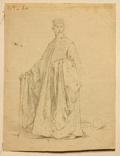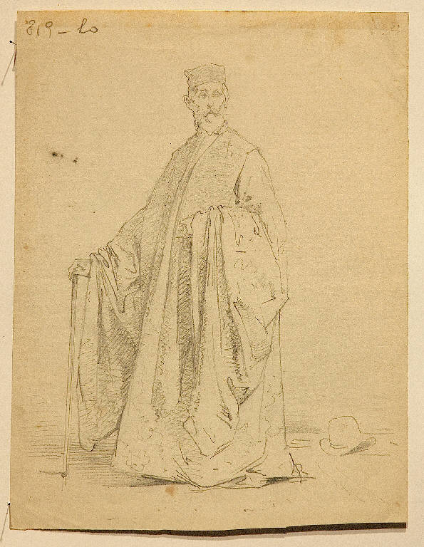 - NOTIZIE STORICO CRITICHE Lo stile di questo disegno e soprattutto il volto della figura, quasi un autoritratto, rimandano alla produzione tarda di Hayez, per esempio all'autoritratto a novant'anni della Galleria Tadini di Lovere ( inv. 316, v. Mazzocca 1994, n. 434); si tratta di uno studio (o autoritratto) eseguito probabilmente autonomamente, senza essere necessariamente collegato a un dipinto di soggetto storico.