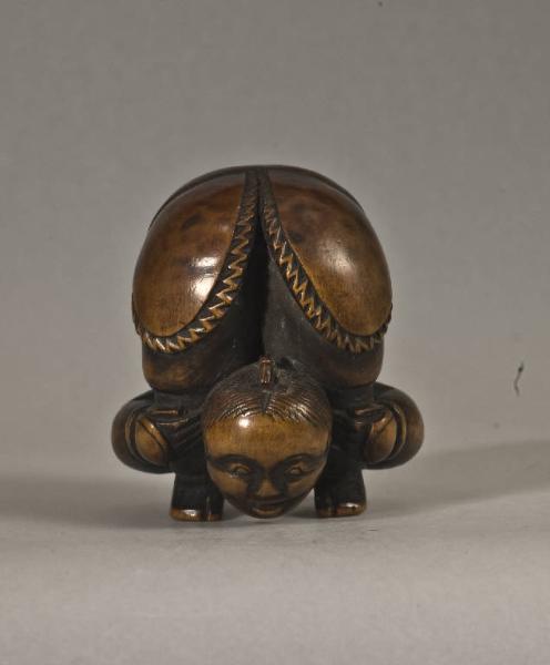 - NOTIZIE STORICO CRITICHE Il soggetto dell'acrobata contorsionista è stato rappresentato in più occasioni dai netsukeshi. La forma compatta e la semplicità della resa del dettaglio, sono elementi che fanno datare l'opera alla fine del XVIII secolo, probabilmente realizzata da artisti attivi nella città di Edo. Il pezzo mostra caratteri stilistici simili alle opere eseguite nell'ambito della scuola di Miwa.
