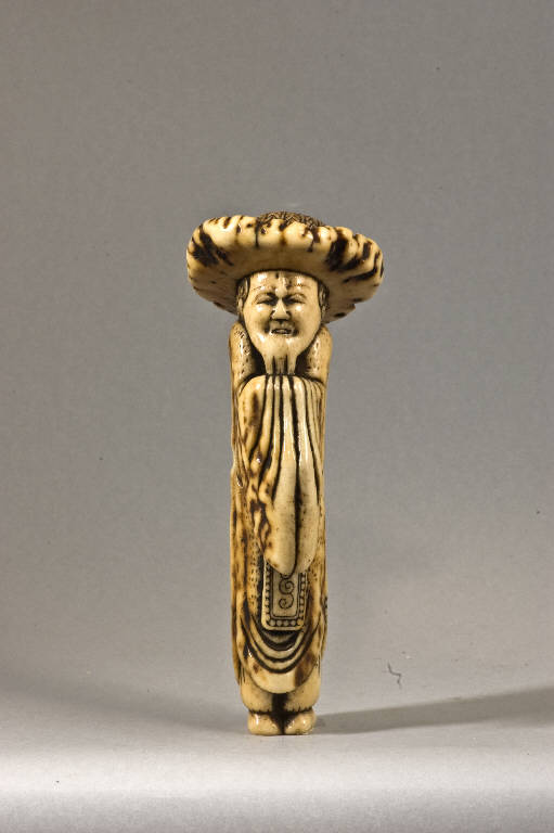 Netsuke raffigurante un uomo in piedi, vestito di un lungo abito le cui ampie maniche nascondono le mani giunte al petto. Ha un lungo pizzetto e porta sulla testa un notevole cappello a falde larghe.