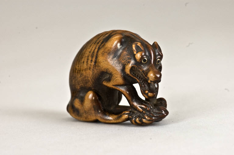 Questo netsuke raffigura un cane selvatico seduto sulle proprie zampe posteriori mentre tra quelle anteriori tiene un cosciotto. Le fauci semiaperte mostrano denti affilati e possenti, tra i quali penzola la lingua.