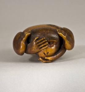 Questo netsuke, in avorio arricchito da fitte trame di inchiostro (sumi) per delineare i particolari, raffigura una scimmia (saru) vestita di una casacca smanicata: le due zampe posteriori sono sollevate fino a coprire i lobi delle orecchie, quella anteriore destra è posata sull'occhio destro, mentre quella sinistra chiude la bocca. Sul dorso compaiono due gruppi analoghi di motivi decorativi con la stilizzazione di una corolla floreale.