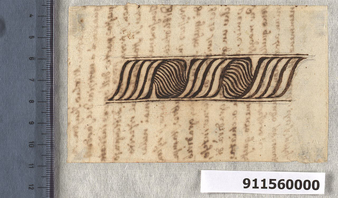 - NOTIZIE STORICO CRITICHE Il presente disegno si riferisce a una fascia decorativa, con motivo a nastro ritorto che, sullo scorcio del XVIII secolo, Sardini aveva ideato, insieme ad altre geometrizzanti, per decorare gli ambienti interni della propria villa a Pieve S. Stefano (Milano, Collezione Sardini Martinelli inv. 9,105c; 9,105/1e; 9,107).