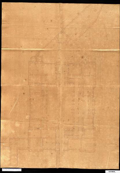 disegno in scala; è eseguito a matita ripassata con inchiostro bruno utilizzando tiralinee e compasso; campiture di acquerello rosa nello spessore delle murature; il disegno è tracciato su supporto di carta composto da due fogli incollati. L'orientamento corretto del foglio prevede che il cortile triangolare stia a destra