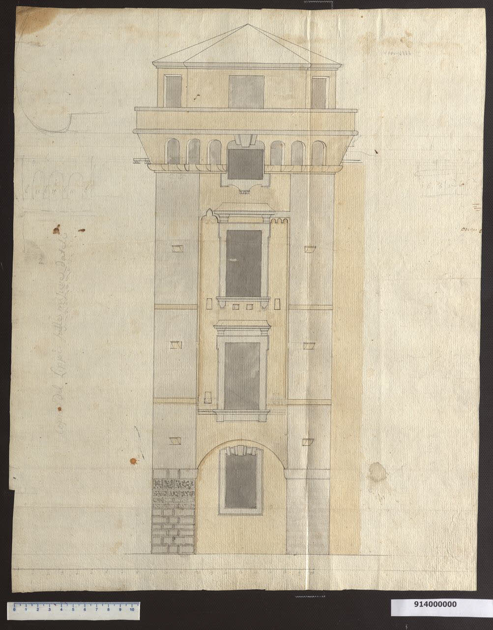 - NOTIZIE STORICO CRITICHE Giacomo Sardini intraprese la ristrutturazione esterna della residenza di famiglia a Lucca nel 1783, dopo aver acquistato alcune proprietà confinanti ed eseguito opere di consolidamento urgenti nelle murature, nei solai e nelle coperture del fabbricato principale.\nL'edificio appartiene alla tipologia della casa-torre, particolarmente diffusa a Lucca nel periodo romanico e rinnovata nel corso del XIV secolo, sostituendo le strutture lignee originali con archi e paramenti murari. La parte più antica del fabbricato sembra risalire ai secoli XIV o XV e alcune parti delle torri anche al secolo XIII.\nUna serie di disegni eseguiti dall'agrimensore Francesconi durante la fase di consolidamento, conservati oggi presso l'archivio Famiglia Minutoli, Contratti et C. (pp. 138-141), come allegati alle perizie dei due maestri muratori Michele Lippi e Giuseppe Maria Guidotti del 1783 (Bertoncini Sabatini, 2007 p. 61, fig. 6 e p. 70 nota 32), restituiscono l'aspetto originario del fabbricato prima dell'intervento di Sardini. Il prospetto presenta delle finestre a bifora e una porta architravata sormontata da un'apertura centinata schermata con una grata di ferro.\nL'intervento di Sardini è volto a ricomporre i diversi eterogenei corpi edilizi, dalle fronti non allineate e ripristinare gli elementi originari incorporati nel corso dei secoli in paramenti murari delle costruzioni successive, tra cui anche parte della torre rappresentata in questo disegno.\nIl progetto definitivo prevede due torri, una per ogni prospetto principale, entrambe coronate da un ballatoio aggettante sorretto da archetti inclinati che raccordano lo sporto ai sottostanti beccatelli in pietra.\nIl ripristino delle strutture delle torri e l'inserimento del cornicione conclusivo, tornarono utili a Sardini per risolvere l'andamento irregolare delle facciate.\nLe notizie sull'intervento effettuato sulla torre di via Cesare Battisti si possono ricavare da un documento conservato presso l'Archivio di Stato di Lucca (Carte di Tommaso Trenta, vol. 15, fasc. 9, Notizie Istoriche, cc.72-73), nel quale si riferisce che la stessa fu messa in evidenza coronandola di archetti con poggiolo, formando un verone (balcone) e interrompendo la linea della facciata che non era allineata perché formata dall'insieme di più case di diverse epoche.\nLa torre raffigurata nel presente disegno che, secondo l'iscrizione di Sardini, fu eseguito dal capomastro Michele Angelo Lippi, presenta delle eleganti finestre simili come fattura a quelle del piano nobile dell'edificio e una finestra incastrata tra gli archetti del ballatoio.\nLa stessa torre, che qui appare isolata, è raffigurata all'interno della fronte dell'edificio in un altro disegno realizzato da Sardini, conservato nella Collezione Minutoli Tegrimi e pubblicato da Paolo Bertoncini Sabatini (Bertoncini Sabatini, 2007 p. 61, fig. 9).\nSu questo disegno, probabilmente preparatorio in vista dell'esecuzione del restauro, sono tracciati anche degli schizzi a grafite, riguardanti il dimensionamento degli archetti nel coronamento e il profilo di una cornice.