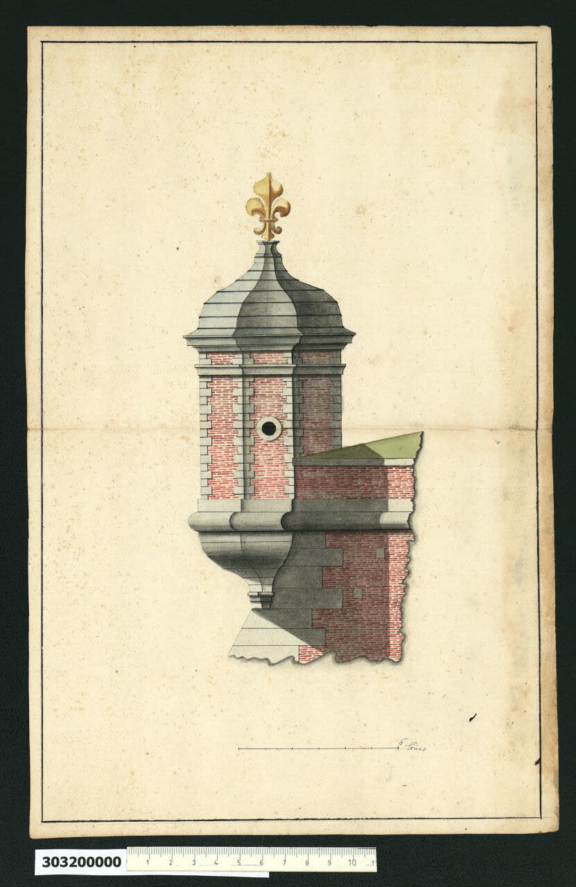 - NOTIZIE STORICO CRITICHE Nell'"Indice" del tomo nel quale era rilegato il disegno viene definito: "Casino [...]".\nIl disegno rappresenta una torretta a sporto o garitta posta sullo spigolo emergente di un bastione, ma non è stato possibile trovare un riferimento che consentisse di attribuirla a un luogo specifico. Tuttavia per analogia stilistica con una serie di elaborati presenti nella collezione (Milano, Collezione Sardini Martinelli invv. 3,26; 3,27; 3,33; 3,34; 3,36) e in particolare con la garitta destinata alla torre bastionata di Neuf-Brisach (ibidem inv. 3,35) è probabile che fosse pensata per una delle fortificazioni realizzate da Sébastien Le Prestre de Vauban (1633-1707), ingegnere militare al servizio di Luigi XIV re di Francia. \nLa datazione specifica proposta ricopre il periodo di attività di Vauban (1655 -1706). Si è indicato come disegno di presentazione progettuale, non si sa se elaborato da lui, da un aiuto o da un esponente della sua cerchia. Non si esclude possa trattarsi anche di un disegno di copia, data l'ampia risonanza dei progetti dell'ingegnere francese, pubblicati successivamente in diversi trattati.\nLa posizione e la conformazione di queste costruzioni era dettata dalla funzione di postazione di controllo e avvistamento. La sporgenza rispetto allo spigolo inclinato della muratura della torre bastionata sottostante è raccordata da una base (struttura di scarico) a mensola ricurva e digradante.\nDalla rappresentazione prospettica si intuisce che poteva essere di forma esagonale o ottagonale. La muratura è in mattoni a vista con un'apertura rotonda contornata in pietra, presumibilmente ripetuta sul lato opposto; gli spigoli sono evidenziati da conci in pietra di due dimensioni alternati o uguali ma sfalsati. La copertura è un cupolotto a spicchi a pagoda e segmentato, chiuso all'apice da un elemento che raffigura il giglio, emblema di regalità in Francia.\nAi lati della garitta è accennato l'attacco al profilo superiore del bastione. La qualità del disegno e lo stile di rappresentazione presentano analogie con una serie di disegni della collezione e in particolare il disegno potrebbe essere messo in relazione con uno di questi, rappresentante un tratto di bastione con garitta e porta (Milano, Collezione Sardini Martinelli inv. 3,33), per alcune corrispondenze, quali il tamponamento in mattoni a vista con conci angolari in pietra, la base di attacco al bastione e il simbolo del giglio sulla copertura, anche se il contesto di inserimento è differente.