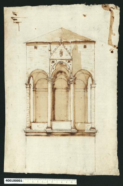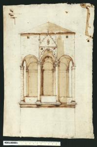 - NOTIZIE STORICO CRITICHE Nell'"Indice" del tomo nel quale era rilegato, il disegno viene definito: "Disegno antico di Chiesa gotica. Sua elevazione".\nIl disegno, che non è stato possibile identificare, raffigura l'alzato di una loggia gotica a tre archi a tutto sesto sul prospetto principale e uno sui laterali, archi sui quali sono impostate le volte a crociera della copertura. Al centro della facciata è inserita un'edicola aggettante con colonne corinzie a reggere un arco trilobato sormontato da un timpano triangolare affiancato da due pennacchi. Il disegno schizzato sul verso del foglio sembrerebbe raffigurare la pianta della loggia.\nNell'angolo superiore sinistro del foglio sono schizzati due profili di cornice.