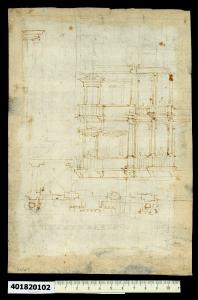 - NOTIZIE STORICO CRITICHE Nell'"Indice" del tomo nel quale era rilegato, il disegno viene definito: "Altri detti come sopra" (leggi: "Schizzi per palazzi").\nSi tratta dello studio in pianta e alzato di una porzione di un edificio. Il prospetto si riferisce ai due piani superiori di un palazzo, articolati in due campate; quella più esterna presenta un balcone retto da mensole, sul quale si apre una portafinestra con timpano triangolare spezzato al centro, accanto, una finestra con timpano al primo piano e semplicemente incorniciata, quella al piano superiore. La seconda campata della facciata presenta su entrambi i piani una loggia ad archi a tutto sesto inquadrata da colonne corinzie, poggianti su alti piedistalli retti da mensole, che aggettano rispetto al filo della parete. Analoga sporgenza presenta la campata centrale della loggia, con balcone retto da mensole e protetto da balaustra.\nSotto il prospetto è schizzata la pianta quotata, che mostra la disposizione degli elementi strutturali. In alto a sinistra, invece, è schizzato il profilo di una cornice.