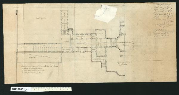 disegno eseguito a inchiostro nero a penna, principalmente con tiralinee e compasso e in parte a mano libera, conserva tracce della preliminare costruzione e di progetto a grafite in parte cancellate; le murature sono acquerellate in colore grigio e rosa; il disegno è tracciato su carta chiara pesante ingiallita composta da tre fogli incollati, con puntinature di costruzione del disegno; sul supporto è applicata una variante su carta bianca incollata, tracciata a inchiostro nero e acquarellata, cui è applicato un successivo pentimento di carta incollato; taglio parziale per eventuale tassello ricomposto