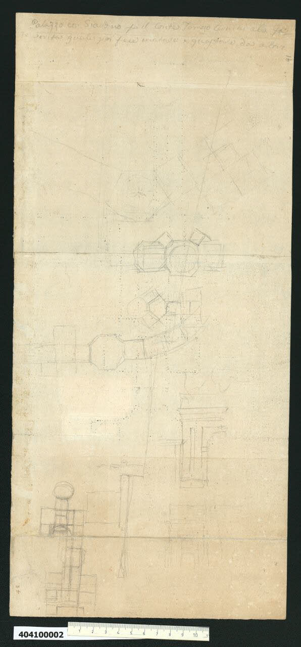 - NOTIZIE STORICO CRITICHE Gli schizzi a grafite tracciati da Domenico Martinelli sul verso della planimetria del palazzo con giardino per il conte Thomas Zaccaria Czernin, sono focalizzati sulla risoluzione del nodo centrale dell'impianto, ossia la grande sala da cui si dipartono gli ambienti residenziali e il prospetto del vestibolo d'ingresso. Tra essi anche uno schizzo accennato dell'impianto del palazzo con giardino per il marchese Ferdinando Obizzi, su cui Martinelli stava in quegli anni lavorando.