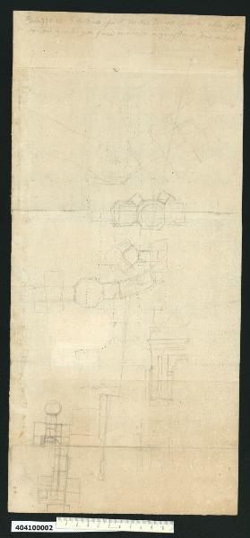 disegno eseguito con grafite, a mano libera;il supporto è di carta chiara pesante ingiallita composta da tre fogli incollati, con puntinature di costruzione del disegno annerite forse per ricalco e taglio parziale per eventuale tassello ricomposto