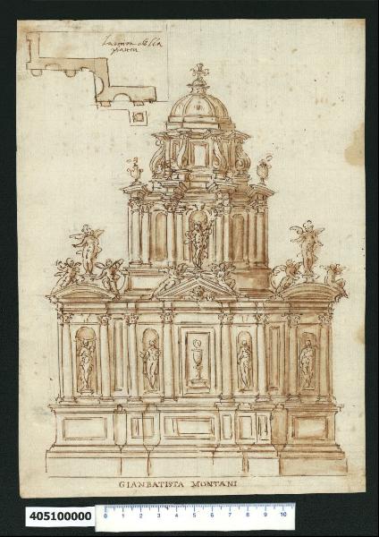 - NOTIZIE STORICO CRITICHE Nell'"Indice" del tomo nel quale era rilegato, il disegno viene definito: "Ciborio col nome del medesimo".\nIl disegno mostra il prospetto e parte della pianta di un ciborio composto da un corpo principale impostato su un alto e sobrio basamento decorato con specchiature, sul quale sono collocate colonne addossate per 3/4 alla parete, lesene e colonne libere di ordine corinzio. Nelle campate sono inserite delle nicchie destinate ad ospitare statue. Sopra questo primo volume si innesta un corpo di dimensioni più piccole anch'esso reso plastico dalla sporgenza delle colonne e relativa trabeazione. A conclusione della costruzione viene posto un tamburo ornato da volute che regge una piccola cupola. Le statue entro le nicchie raffigurano dei Santi mentre al centro è raffigurato il calice con l'eucarestia. Alla sommità del timpano triangolare è collocata la statua di Cristo. Il presente tabernacolo è uno dei tanti disegnati da Montano (cfr. Milano, Collezione Sardini Martinelli invv. 6,40; 6,41; 6,138-139r) e in parte pubblicati da G. B. Soria nell'opera "Tabernacoli diversi, nuovamente inventati da M. Giovanbatista Montano milanese ..." data alle stampe nel 1628.
