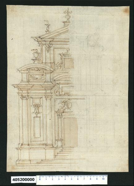 disegno eseguito a grafite poi ripassata a penna con inchiostro bruno nella metà sinistra del disegno; tracciato con l'ausilio del tiralinee, compasso e mano libera per gli elementi ornamentali; supporto di carta avorio