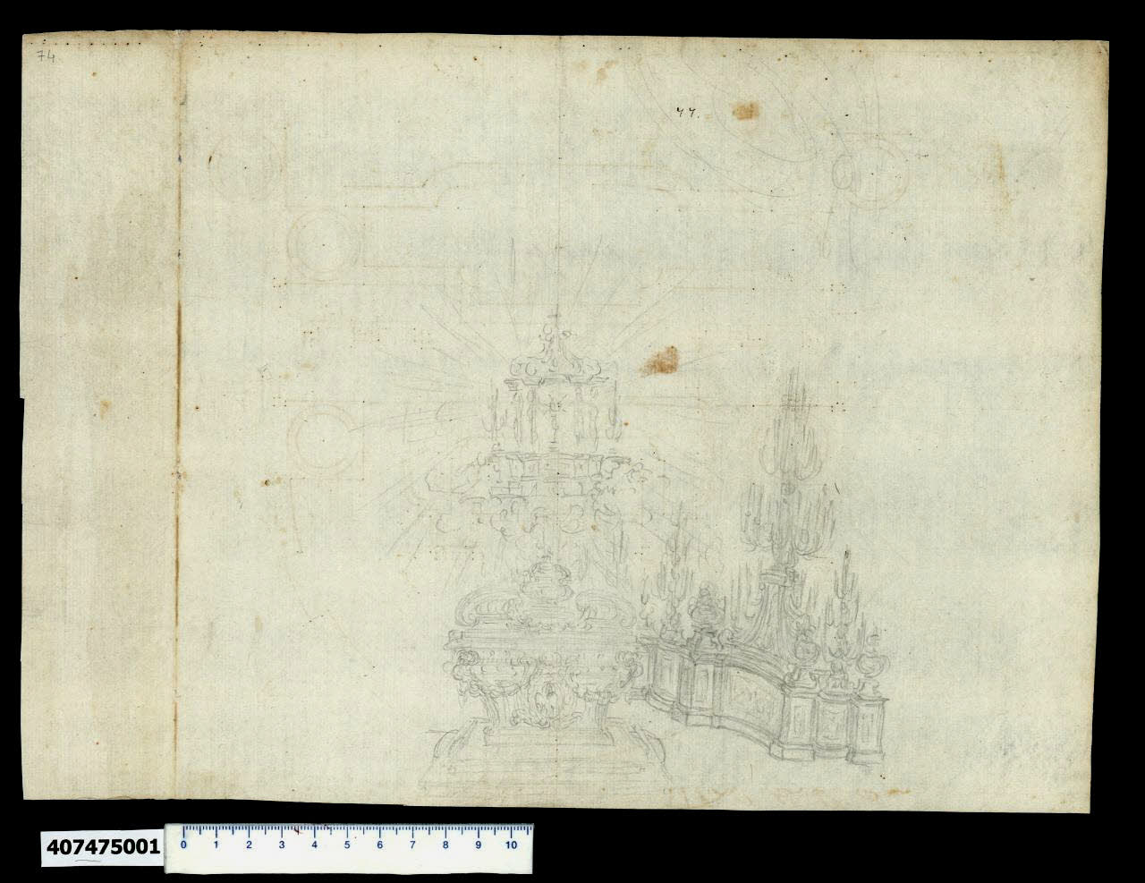 - NOTIZIE STORICO CRITICHE Nell'"Indice" del tomo nel quale era rilegato, il disegno viene definito: "Idea di pioggia per illuminare".\nIl disegno raffigura un apparato funebre con in primo piano il sarcofago, particolarmente ornato, che ben si accompagna al complesso architettonico in cui è inserito. Il carattere della composizione è improntato sull'esuberanza degli elementi decorativi: volute rovesce che reggono festoni sul coperchio, ghirlande e fiori che ornano il sacello appoggiato su un basamento con scudo centrale. Alle spalle del sarcofago, appena accennato a grafite, si trova l'altare con il tabernacolo, mentre a destra è disegnata una struttura, probabilmente lignea, ad andamento curvilineo sulla quale sono appoggiati numerosi grossi candelabri e vasi.