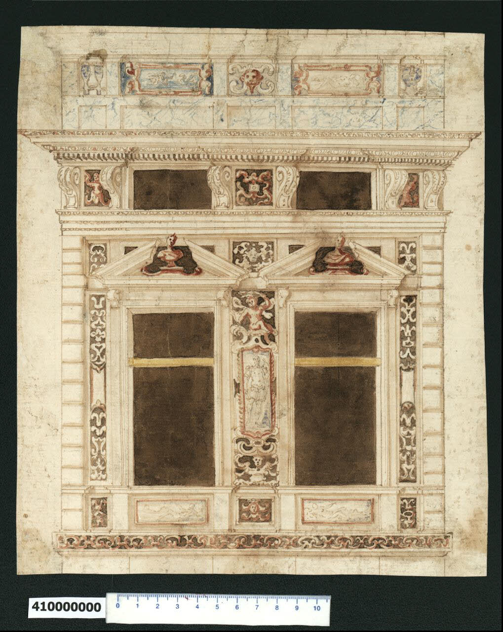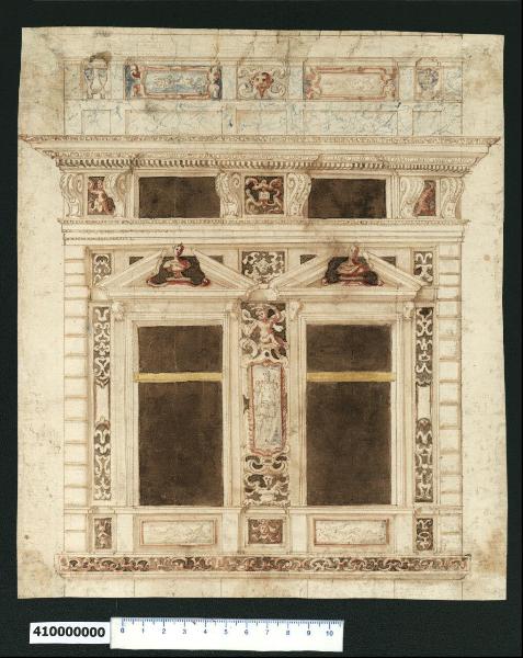 - NOTIZIE STORICO CRITICHE Nell'"Indice" del tomo nel quale era rilegato il disegno viene definito: "Facciata di Fabbrica antica dipinta".\nIl disegno rappresenta la parte superiore della facciata di un edificio di piccole dimensioni ma riccamente decorato. La superficie muraria presenta due grandi finestre incorniciate con timpano spezzato sorretto da mensole a voluta, in cui sono inseriti due mezzi busti su piedistallo, poste tra una cornice decorata con un motivo a nastri intrecciati in basso e una cornice sagomata superiore. Le finestre sono inquadrate ai margini dell'edificio da due fasce a bugnato e inframmezzate da fasce decorative di cui quella mediana, doppia rispetto alle laterali, riporta centralmente la figura incorniciata di un personaggio dell'antica Roma. Sopra la cornice il piano sottotetto, con due basse aperture rettangolari in corrispondenza delle finestre sottostanti, poste tra tre coppie di grandi mensole a voluta inframmezzate da riquadri decorati, che sorreggono un cornicione dentellato molto aggettante. Questo, che dovrebbe concludere l'edificio, è invece sovrastato da un'alta fascia, probabilmente aggiunta in un secondo tempo, rivestita in marmo e ripartita in riquadri in parte decorati. \nDiverse ipotesi potrebbero essere fatte riguardo alle finalità del disegno: dalla semplice riproduzione di un edificio esistente, alla progettazione di questo sopralzo. Da notare l'assonanza della figura del personaggio dell'antica Roma con quelli delle statue di un altro disegno della Collezione (Milano, Collezione Sardini Martinelli inv. 4,102).\nL'analisi stilistica rimanda all'ambito italiano, forse all'area genovese, della metà del Cinquecento.