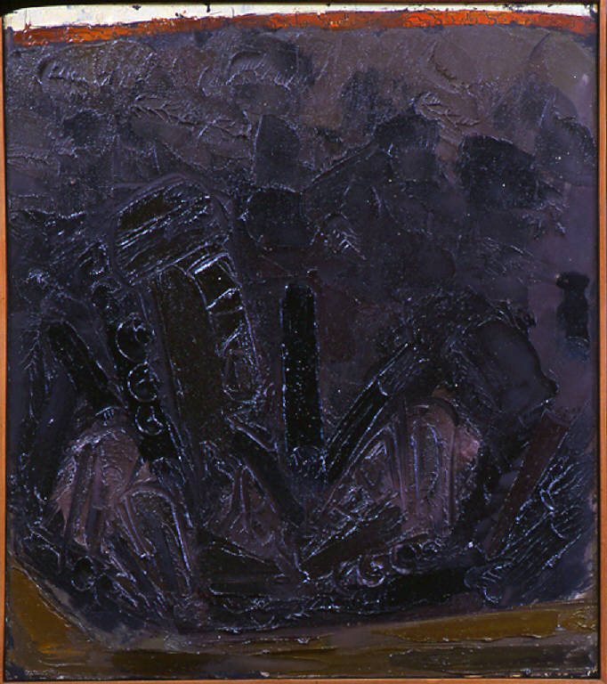 - NOTIZIE STORICO CRITICHE L'immagine del treno distrutto è motivo che, come si apprende dai diari, prende avvio da un terribile attentato avvenuto lungo la linea ferroviaria Bologna-Firenze. Emerso prepotentemente nell'immaginario congdoniano tra il marzo e il maggio, collocandosi, quindi, tra i paesagi sublacensi e i Crocefissi, il treno, immagine-simbolo connessa all'idea del viaggio, diviene protagonista indiscusso di questa serie. Come già era accaduto per quello nel deserto tunisino, è uno scuro fossato a contenere i frammenti che, nelle diverse versioni, si tendono e si contorcono, a suggellare il viaggio concluso nella voragine di morte. Come speso accade, nella parte superiore del dipinto, a scandire orizzontalmente le due parti della composizione, corre una strada, unico indizio di colore, in questo caso solamente accennato, tra i toni nero-bruniti e terrosi che qui occupano la quasi totalità del quadro.