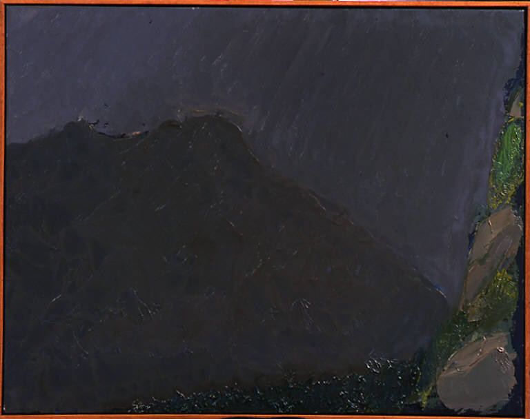 - NOTIZIE STORICO CRITICHE Quest'opera costituisce un unicum nella serie dei Subiaco di questa stagione: abbandonata per un attimo la classica visione frontale, Congdon offre in questo caso una visione "in avvicinamento" come suggerisce la notazione stessa che completa il titolo dell'opera (verso Subiaco). In primissimo piano, schiacciato sul lato inferiore e destro del quadro, è dipinto uno scorcio di versante di cui è messo in evidenza il dettaglio delle rocce nude e della vegetazione; sullo sfondo, in due tonalità appena differenti di grigio, si trovano la montagna ripresa lateralmente e il cielo; fra i due piani si intuisce la profondità della valle in cui scorre l'Aniene. L'utilizzo calibratissimo dei colori in quest'opera conferisce all'intera visione un intenso gusto atmosferico, oltre a rendere evidente il senso della spazialità così naturale in Congdon, quasi avesse dipinto la distanza esatta fra le due sponde della valle.