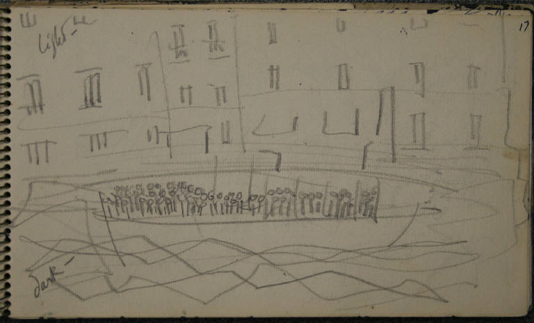 - NOTIZIE STORICO CRITICHE Congdon si è raramente dedicato al disegno come forma espressiva autonoma, così la mole di disegni raccolti sui taccuini non sono altro che appunti visivi presi durante numerosi viaggi. In questo senso non è possibile, se non raramente, assegnare al singolo disegno un'opera finita direttamente corrispondente, così questi disegni non vengono nemmeno ad essere schizzi preparatori. La sommatoria di tutti i disegni relativi a un luogo danno origine a una serie di dipinti che non hanno un corrispettivo oggettivo nei disegni stessi. Tutto questo giustifica la presenza degli appunti all'interno delle immagini (colori, sfumature e spiegazioni di vario genere). Le città marinare sono nei taccuini di Congdon uno dei soggetti più presenti, data la sua abitudine di viaggiare in nave. Qui si sofferma nella descrizione dei posti più significativi da un punto di vista storico artistico; in particolare indugiando sui palazzi che si affacciano sui canali, dei campi con i caratteristici pozzi al centro, fino alle scene portuali e ai turisti affollati sul vaporetto.