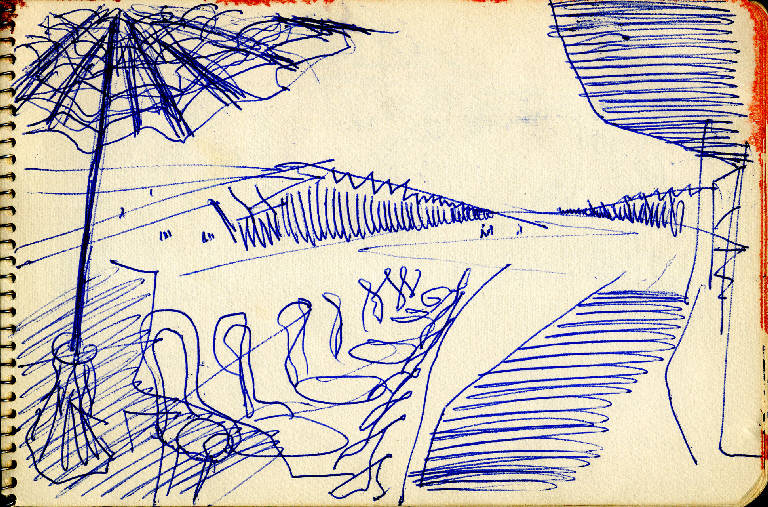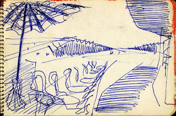 - NOTIZIE STORICO CRITICHE Congdon si è raramente dedicato al disegno come forma espressiva autonoma, così la mole di disegni raccolti sui taccuini non sono altro che appunti visivi presi durante numerosi viaggi. In questo senso non è possibile, se non raramente, assegnare al singolo disegno un'opera finita direttamente corrispondente, così questi disegni non vengono nemmeno ad essere schizzi preparatori. La sommatoria di tutti i disegni relativi a un luogo danno origine a una serie di dipinti che non hanno un corrispettivo oggettivo nei disegni stessi. Tutto questo giustifica la presenza degli appunti all'interno delle immagini (colori, sfumature e spiegazioni di vario genere). Le città marinare sono nei taccuini di Congdon uno dei soggetti più presenti, data la sua abitudine di viaggiare in nave. Qui si sofferma nella descrizione dei posti più significativi da un punto di vista storico artistico ma non disdegna i dettagli quotidiani delle folle dei turisti come dei risvolti più privati che incontra nel suo soggiorno. Conosciamo così i dettagli dell'arredo degli interni (dal bar alla stanza d'albergo). Nei disegni veneziani il tratto si fa particolarmente ricco per arrivare a descrivere tutti gli archi di piazza San Marco, il brulichio delle folle viste dall'alto a passeggio sulle rive del canal grande ecc ecc. fino alle fantasie fiorate dei vestiti delle signore ai tavolini del bar. Le stanze d'albergo, qui come in altri taccuini, non possono non riportare alla memoria gli interni di Matisse, tanto dettagliati nella ricchezza di particolari da diventare un unico lavorio di superficie.