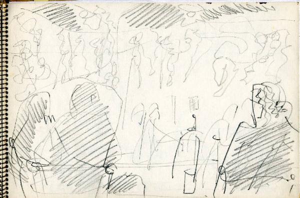 - NOTIZIE STORICO CRITICHE Congdon si è raramente dedicato al disegno come forma espressiva autonoma, così la mole di disegni raccolti sui taccuini non sono altro che appunti visivi presi durante numerosi viaggi. In questo senso non è possibile, se non raramente, assegnare al singolo disegno un'opera finita direttamente corrispondente, così questi disegni non vengono nemmeno ad essere schizzi preparatori. La sommatoria di tutti i disegni relativi a un luogo danno origine a una serie di dipinti che non hanno un corrispettivo oggettivo nei disegni stessi. Tutto questo giustifica la presenza degli appunti all'interno delle immagini (colori, sfumature e spiegazioni di vario genere). Le città marinare sono nei taccuini di Congdon uno dei soggetti più presenti, data la sua abitudine di viaggiare in nave. Qui si sofferma nella descrizione dei posti più significativi da un punto di vista storico artistico ma non disdegna i dettagli quotidiani delle folle dei turisti come dei risvolti più privati che incontra nel suo soggiorno. Conosciamo così i dettagli dell'arredo degli interni (dal bar alla stanza d'albergo). Nei disegni veneziani il tratto si fa particolarmente ricco per arrivare a descrivere tutti gli archi di piazza San Marco, il brulichio delle folle viste dall'alto a passeggio sulle rive del canal grande ecc ecc. fino alle fantasie fiorate dei vestiti delle signore ai tavolini del bar. Le stanze d'albergo, qui come in altri taccuini, non possono non riportare alla memoria gli interni di Matisse, tanto dettagliati nella ricchezza di particolari da diventare un unico lavorio di superficie.