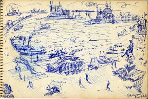 - NOTIZIE STORICO CRITICHE Congdon si è raramente dedicato al disegno come forma espressiva autonoma, così la mole di disegni raccolti sui taccuini non sono altro che appunti visivi presi durante numerosi viaggi. In questo senso non è possibile, se non raramente, assegnare al singolo disegno un'opera finita direttamente corrispondente, così questi disegni non vengono nemmeno ad essere schizzi preparatori. La sommatoria di tutti i disegni relativi a un luogo danno origine a una serie di dipinti che non hanno un corrispettivo oggettivo nei disegni stessi. Tutto questo giustifica la presenza degli appunti all'interno delle immagini (colori, sfumature e spiegazioni di vario genere). Le città marinare sono nei taccuini di Congdon uno dei soggetti più presenti, data la sua abitudine di viaggiare in nave. Qui si sofferma nella descrizione dei posti più significativi da un punto di vista storico artistico ma non disdegna i dettagli quotidiani delle folle dei turisti come dei risvolti più privati che incontra nel suo soggiorno. Conosciamo così i dettagli dell'arredo degli interni (dal bar alla stanza d'albergo). Nei disegni veneziani il tratto si fa particolarmente ricco per arrivare a descrivere tutti gli archi di piazza San Marco, il brulichio delle folle viste dall'alto a passeggio sulle rive del canal grande ecc ecc. fino alle fantasie fiorate dei vestiti delle signore ai tavolini del bar. Le stanze d'albergo, qui come in altri taccuini, non possono non riportare alla memoria gli interni di Matisse, tanto dettagliati nella ricchezza di particolari da diventare un unico lavorio di superficie.
