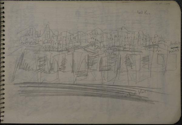 - NOTIZIE STORICO CRITICHE Congdon si è raramente dedicato al disegno come forma espressiva autonoma, così la mole di disegni raccolti sui taccuini non sono altro che appunti visivi presi durante numerosi viaggi. In questo senso non è possibile, se non raramente, assegnare al singolo disegno un'opera finita direttamente corrispondente, così questi disegni non vengono nemmeno ad essere schizzi preparatori. La sommatoria di tutti i disegni relativi a un luogo danno origine a una serie di dipinti che non hanno un corrispettivo oggettivo nei disegni stessi. Accanto alla produzione di disegni paesaggistici, soggetto quasi esclusivo nei taccuini di viaggio di Congdon, compaiono sporadicamente temi diversi. Nel viaggio a Santorini del 1955 l'artista è colpito non solo dalla grandezza naturalistica del luogo, ma anche da alcune piccolezze tipiche del villaggio, dalle casette arroccate ai pesci appena pescati. Il tutto sempre raccontato con grande economia di segni eppure con grande espressività ed esattezza.