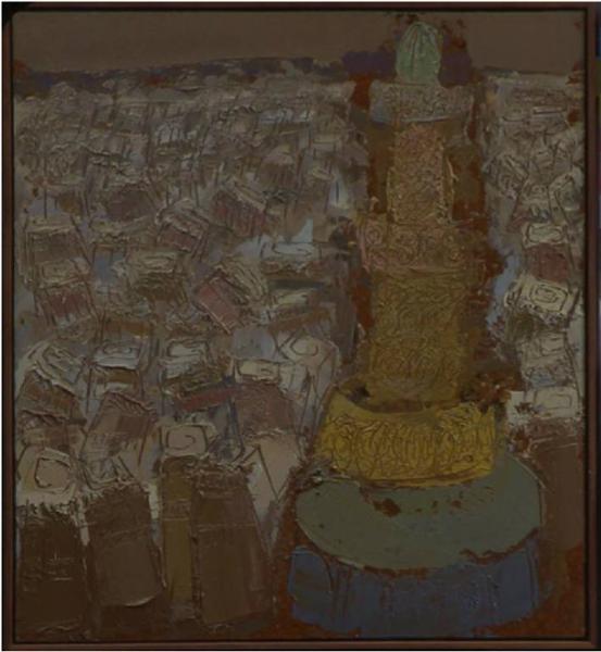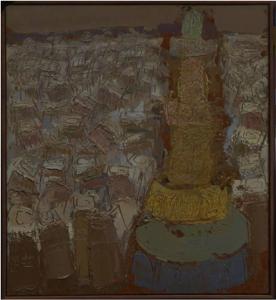 - NOTIZIE STORICO CRITICHE Giunto a Sana'a nello Yemen Congdon torna a confrontarsi con il tema del monumento: la candida magia dei palazzi merlattati di finestre diviene, presa dall'alto di un minareto, un brulichio confuso e instabile di architetture. Risulta caratteristica, come in altre opere dello stesso momento e sullo stesso tema, la resa della folla cittadina e del decorativismo insistito attraverso un segno caotico e aggrovigliato su se stesso.