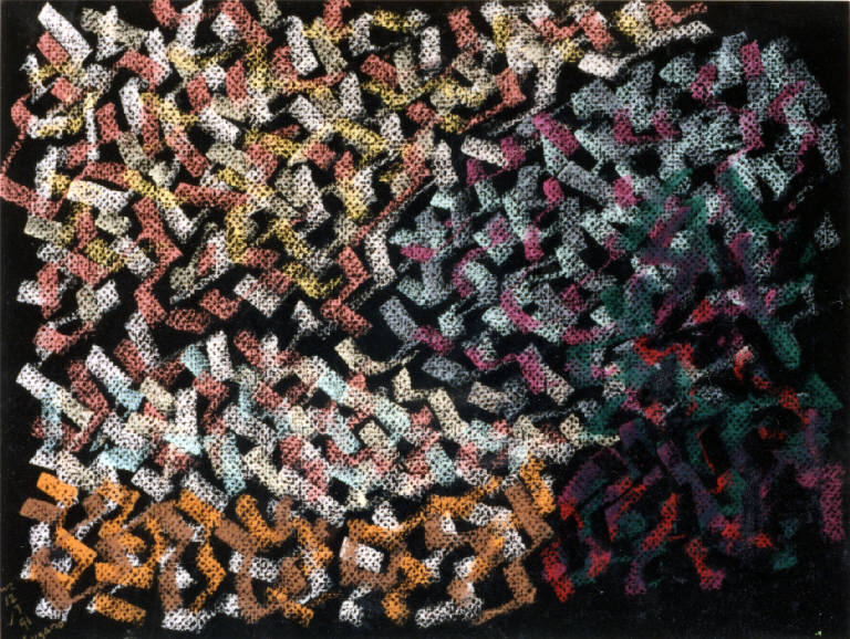 - NOTIZIE STORICO CRITICHE Il brulichio di linee spezzate, intrecciate e sovrapposte, diventa in una parte dei pastelli il motivo dominante che riempie quasi come in una composizione all over la totalità del foglio. Il senso di profondità, che evita la bidimensionalità pura, è dato dall'emergere fra gli spazi del fondo del supporto. A volte predomina lo studio di un elemento del paesaggio, ma più spesso l'intreccio di segni rimane organizzato in masse che rendono più leggibili gli scenari in senso naturalistico: si distinguono, ancora, i campi, il cielo, un albero oppure un cespuglio...