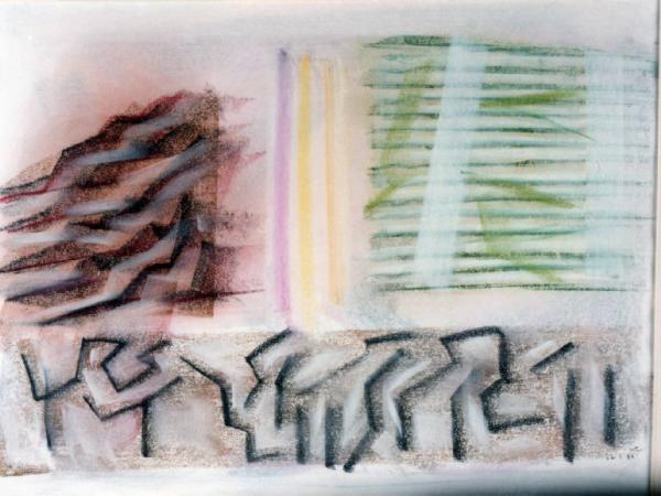 - NOTIZIE STORICO CRITICHE Congdon affianca alla produzione dei dipinti le prime opere a pastello all'inizio degli anni Ottanta. Le prime prove, come in questo caso, risentono ancora di una visione di tipo naturalistico: il paesaggio rurale, che egli osserva della finestra del suo studio alla Cascinazza come tra le montagne di Subiaco, viene restituito in maniera sintetica e allo stesso tempo estremamente narrativa. Compaiono una serie di elementi che rimangono come imprescindibili punti di riferimento: il campo che si incunea verso al linea dell'orizzonte, il filare di alberi che separa la terra dal cielo e il segno scuro del canale sulla destra che fiancheggia il campo, la montagna che chiude la vista della valle dell'Aniene.