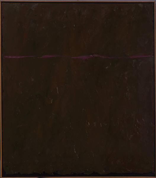 - NOTIZIE STORICO CRITICHE In quest'opera Congdon si cimenta con il "monocromo" in versione scura, non immemore forse di alcune serie di Rothko nell'affiancare il marrone bruciato con il viola. La riga posta a circa tre quarti dell'altezza del quadro determina una sottilissima e delicata vibrazione luminosa, quasi una veloce sequenza di note subito riassorbita nel silenzio della tela (o forse della terra?).