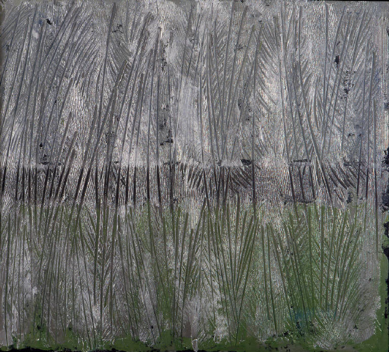 - NOTIZIE STORICO CRITICHE Congdon si cimenta in quest'opera con uno straordinario effet del pluie: un filtro di pittura metallica scende a obliterare la distesa dei campi con il suo tessuto all over fittamente inciso al punteruolo da linee verticali, che lascia soltanto trasparire tre fascie di colore, verde, grigio chiaro e grigio scuro, a suggerire la linea del campo e forse un filare di alberi.