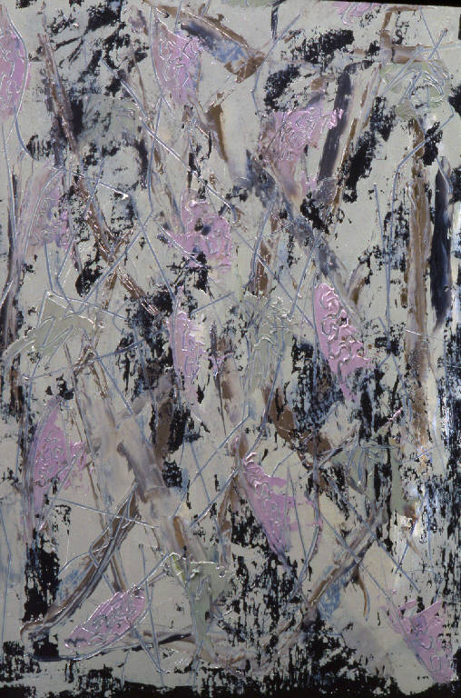 - NOTIZIE STORICO CRITICHE Caratteristica della grande apertura tematica di Congdon è anche l'attenzione per motivi diversi, come accade nel soggetto floreale, documentato nelle serie delle Violette e del Glicine. Il tema si presta a una classica composizione all-over, in cui il panello viene uniformemente ricoperto di macchie di colore e percorso da preziose calligrafie incise nel pigmento con la punta della spatola. Il tessuto dell'opera è ulteriormente arricchito dai buchi che lasciano trasparire il fondo nero.