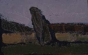 - NOTIZIE STORICO CRITICHE Paesaggio chiaramente descrittivo, secondo una leggibilità ribadita nel titolo, l'opera ci presenta un albero posto al centro della composizione. Il pittore inizia studiando la posizione degli oggetti nel paesaggio e quindi sul piano del pannello intervenendo sul fondo nero con una pittura blu ancora visibile fra le campiture di colore successivamente riempite. Congdon aggiunge poi ulteriore descrittività intervenendo con il punteruolo sulle fronde dell'albero e con il pettine nei campi. L'albero con una lettura a posteriori diventa un soggetto simbolico del suo vocabolario come elemento verticale che nascendo dalla terra si prontende nel cielo.