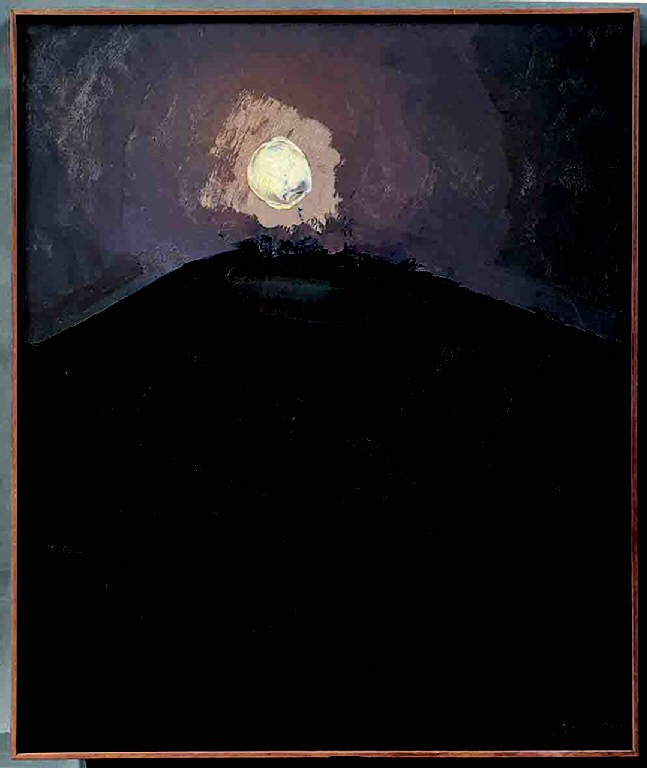- NOTIZIE STORICO CRITICHE La dilatazione "cosmica" dello spazio circoscritto del monastero già verificata nella serie Monastero del '90, si coglie in "Luna su Cascinazza" del maggio 1991: la piramide scura del tetto si protende verso l'alto, simile a una montagna, fino a sfiorare il disco lunare e a riceverne un riverbero di luce. Vengono alla mente, oltre ai recenti "Cimitero San Martino", anche certe lune sublacensi degli anni '60 e '70.