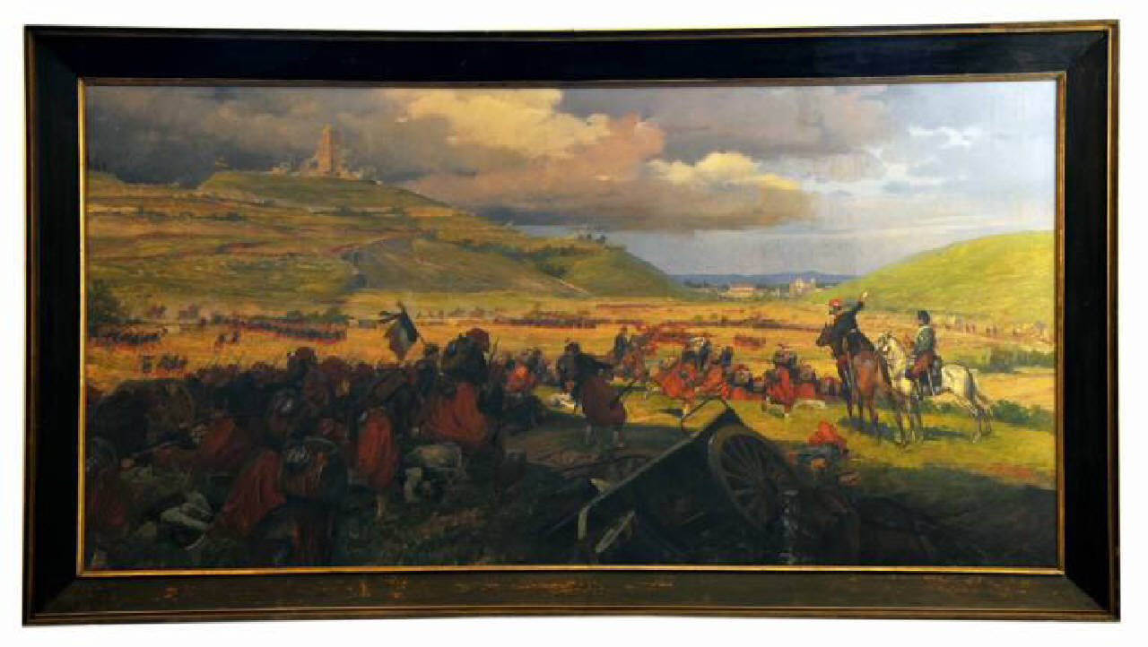 - NOTIZIE STORICO CRITICHE Il momento rappresentato è successivo alla battaglia: l'esercito francese sta sfondando la linea nemica in direzione del paese di Solferino.\nIl bozzetto del dipinto, ad opera dell'artista Riccardo Salvadori, si conserva nelle collezioni del Comune di Mantova, scheda 0300623851.