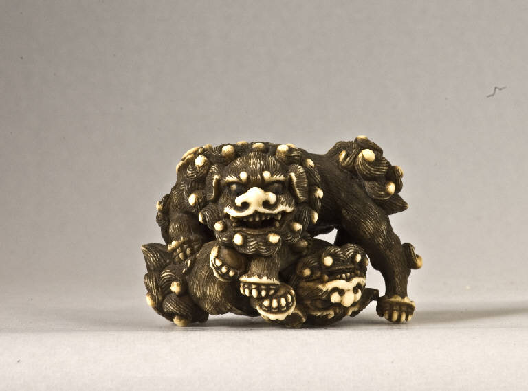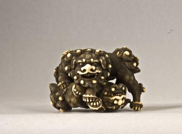 Netsuke raffigurante due shishi, maschio e femmina, che giocano uno sull'altro.