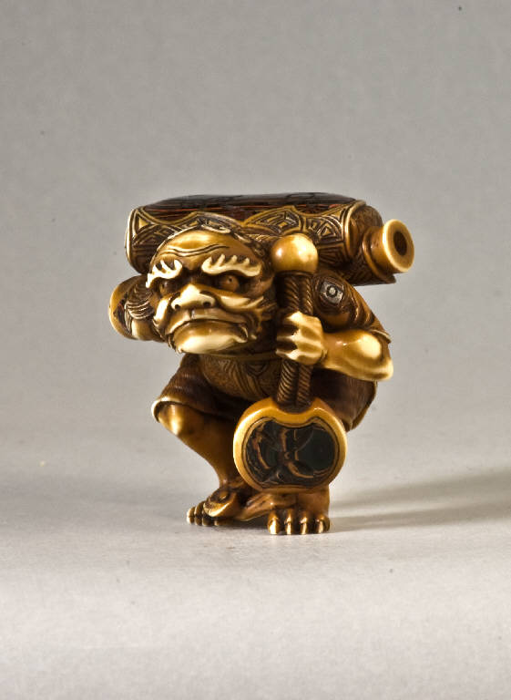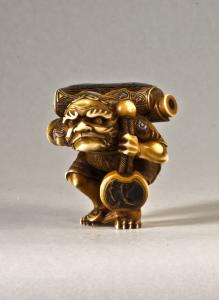 Netsuke-okimono raffigurante un piccolo demone (oni) vestito di un abito decorato con la stilizzazione di un arabesco floreale; sulle spalle trasporta una borsa da tabacco (tonkotsu), dall'interno della quale si vede spuntare l'astuccio (kiseruzutsu) per la pipa (kiseru), sorreggendola con la mano sinistra per il laccio (himo) tra l'himotoshi e il netsuke di tipo manju. Parte della borsa e la superficie a vista del netsuke sono rivestite da un sottile strato di guscio di tartaruga (bekko), forse applicato ad una base di lacca rossa.