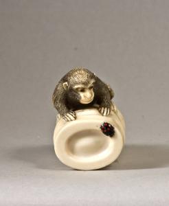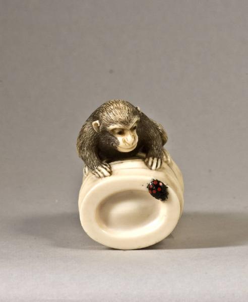 Netsuke raffigurante un cucciolo di scimmia (saru) seduto a cavalcioni su una sezione di fusto di bambù (take); sul davanti, si è posata una coccinella, dipinta molto realisticamente in nero a pallini rossi.