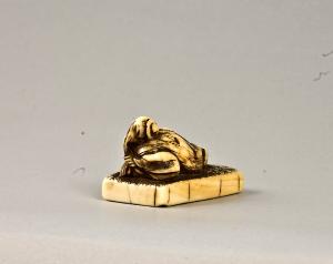 - NOTIZIE STORICO CRITICHE Inaba Tsuryu, autore del Soken kisho (1781, vol. 7, pp. 16-17), illustra numerosi netsuke a forma di sigillo simili a questo nell'impostazione, sebbene nessuno in particolare possa indubitabilmente associarsi. Si tratta dunque di una tipologia di netsuke prevalentemente realizzata nel XVIII secolo, ispirata ad analoghi oggetti cinesi, aventi spesso funzione di sigillo.