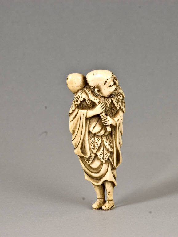 Si tratta sicuramente della raffigurazione di un immortale taoista - molto probabilmente Tobosaku - con il volto sorridente, il cranio calvo e la barba pronunciata; vestito di un'ampia tonaca sulla quale si sovrappongono, come impermeabile, foglie di artemisia intorno al collo e nei pressi della cintura, tiene sulle spalle una pesca (momo) dell'immortalità; i due fori dell'himotoshi si trovano sul retro al centro, quello di dimensioni maggiori posto più in basso rispetto a quello più piccolo.