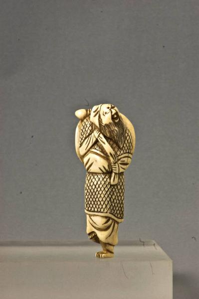Netsuke raffigurante un uomo di età avanzata, chiaramente cinese, stante e sorridente, vestito di un impermeabile di paglia; sulle spalle tiene un grande cappello circolare di paglia, mentre porta una fiasca a zucca legata ad una fascia di tessuto trattenuta per un lembo con la mano sinistra. I due fori dell'himotoshi si trovano sul retro, uno nella parte inferiore del cappello, l'altro per metà ancora sul cappello e per l'altra metà sul dorso del personaggio.