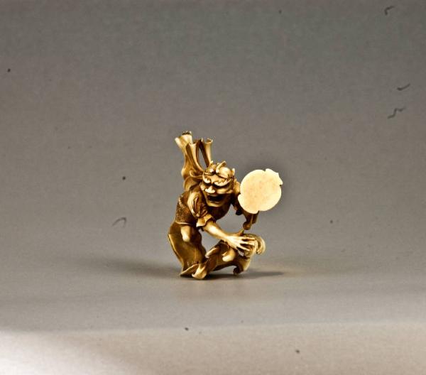 Okimono raffigurante un oni in volo; con la mano sinistra mantiene la presa di uno specchio (kagami), alla quale è legato un nastro con due nappe.