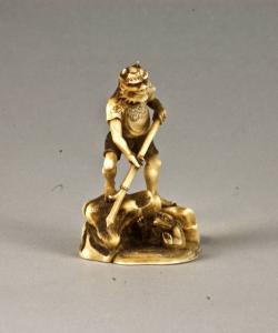 Questo okimono raffigura un oni che, dall'alto di un gruppo di rocce, dà la caccia con un'arma in asta ad un kappa per metà corpo immerso nel corso d'acqua simulato a rilievo sulla base della composizione.