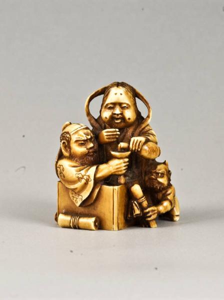 - NOTIZIE STORICO CRITICHE La firma Masakazu impressa sul lato inferiore di questo pezzo, va riferita ad un non meglio noto artigiano specializzato nella realizzazione di netsuke in porcellana; attivo nel XIX secolo, questo Masakazu lavorò in una delle numerose fornaci presenti nell'isola di Hirado (provincia di Hizen), dove fin dal XVII secolo si producevano porcellane di altissima qualità. Secondo il Lawrence (1997, p. 99, App. Sei fig. 60), i netsuke con questa marca sarebbero repliche di originali in avorio realizzati da Masakazu, netsukeshi attivo a Kyoto tra la fine del XVIII e l'inizio del XIX secolo, i discendenti del quale si trasferirono in seguito ad Osaka. Un pezzo del tutto analogo a questo fu illustrato dal Weber (1923, I, pl. XXI, n. 7); un altro uscito dallo stesso stampo è nella collezione Hull Grundy del British Museum (Harris 1987, p. 23, n. 7); un altro molto simile è conservato nella collezione Trumpf nel Linden-Museum di Stoccarda (Jirka-Schmitz 2000b, n. 155); un altro ancora è stato battuto in un'asta della Nagel (Nagel 2003, lot 1787); un altro è illustrato dal Noetzel (1981, tav. VI, n. 113). Della stessa manifattura ricordiamo, inoltre, una figura di Gama Sennin nel British Museum (Barker - Smith 1976, p. 163, n. 373) e nel volume del Noetzel (1981, n. 131), un karako su un bufalo illustrato dal Lazarnick (1982, I, p. 711), oltre al pezzo con scimmia e cavallo della collezione Lanfranchi (v. inv. n. 5641: Morena 2008, p. 216, n. 219).