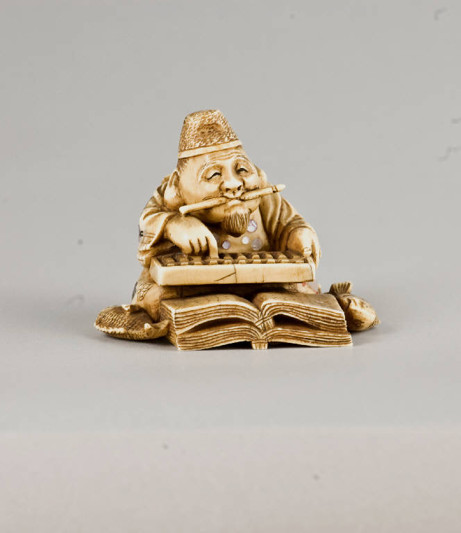 Questo okimono raffigura Ebisu seduto, con ampi lobi degli orecchi e pizzetto pronunciato: con le labbra trattiene un pennello (fude), mentre con le mani fa calcoli con un abaco (soroban); ai suoi piedi sono posati uno sopra l'altro due libri aperti, ai lati dei quali si trovano due pesci di mare (tai); sulla coperta del libro più in basso è riportata l'iscrizione "daifukucho", "libri di conto". L'abito è arricchito di intarsi in madreperla (raden), alcuni dei quali raffigurano il motivo "della moneta" (shippo), mentre un altro mostra un rametto a tre foglie.