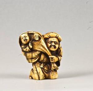 Netsuke raffigurante Daikoku in ginocchio, con il sacco dei tesori sulla spalla destra, per portare il quale si aiuta con entrambe le mani; dalla sacca si vede spuntare il busto di un "bambino cinese" (karako), nella cui mano sinistra sta posato un frutto. La mano sinistra del bambino è scheggiata.